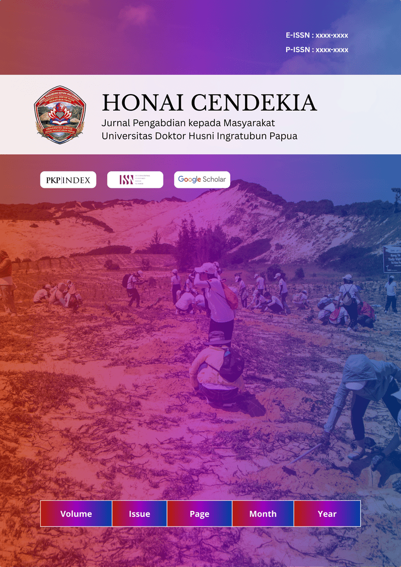 HONAI CENDEKIA: Jurnal Pengabdian kepada Masyarakat Universitas Doktor Husni Ingratubun Papua adalah jurnal ilmiah yang diterbitkan sebagai media publikasi hasil kegiatan pengabdian kepada masyarakat yang dilakukan oleh dosen, peneliti, mahasiswa, dan praktisi dari berbagai disiplin ilmu. Jurnal ini bertujuan untuk mendiseminasikan hasil penerapan penelitian, inovasi, dan teknologi yang diimplementasikan secara langsung di masyarakat sebagai bentuk kontribusi perguruan tinggi dalam pembangunan nasional, khususnya di wilayah Papua dan Indonesia pada umumnya.